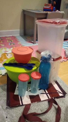 Paglalarawan ng Content: a bunch of plastic containers including a tupperware container
