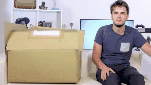 Paglalarawan ng Content: a man is sitting on a couch next to a cardboard box