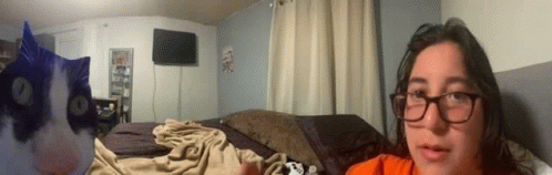 Paglalarawan ng Content: a woman wearing glasses is sitting on a bed with a cat in the background .