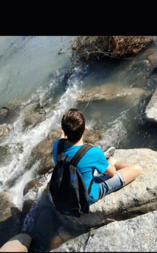 Paglalarawan ng Content: a boy with a backpack sits on a rock near a river