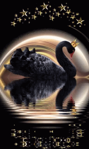 Paglalarawan ng Content: a black swan with a gold crown on its head is in the water