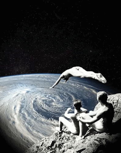 Paglalarawan ng Content: a group of people sitting on a rock watching a naked man jump into the earth