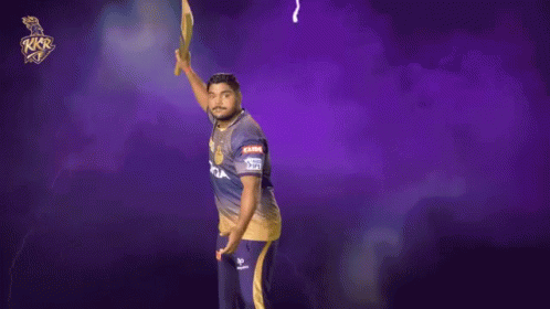 Paglalarawan ng Content: a man holding a cricket bat in front of a purple background with the letters rkr on it