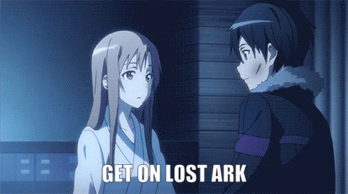 Paglalarawan ng Content: a man and a woman are looking at each other with the words get on lost ark above them