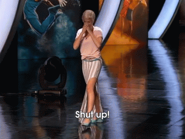 Paglalarawan ng Content: a woman standing on a stage with the words shut up written on the floor
