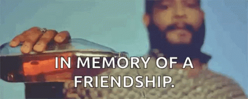 Paglalarawan ng Content: a man with a beard is holding a bottle of whiskey and says `` in memory of a friendship '' .