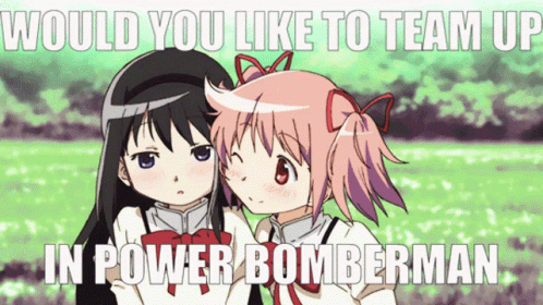 Paglalarawan ng Content: would you like to team up in power bomberman written on a picture of two anime girls