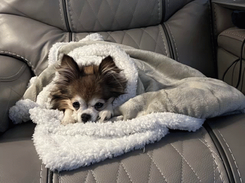 Paglalarawan ng Content: a small brown and white dog wrapped in a blanket on a couch