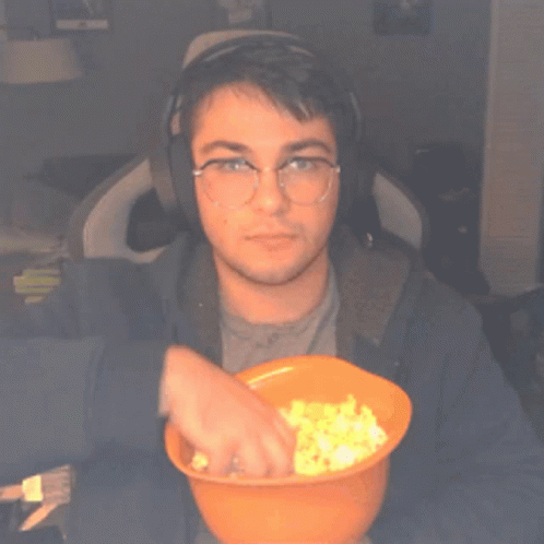 Paglalarawan ng Content: a man wearing headphones and glasses is eating a bowl of corn