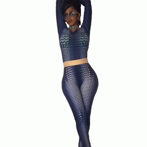 Paglalarawan ng Content: a woman in a blue jumpsuit with a gold belt stands with her arms in the air