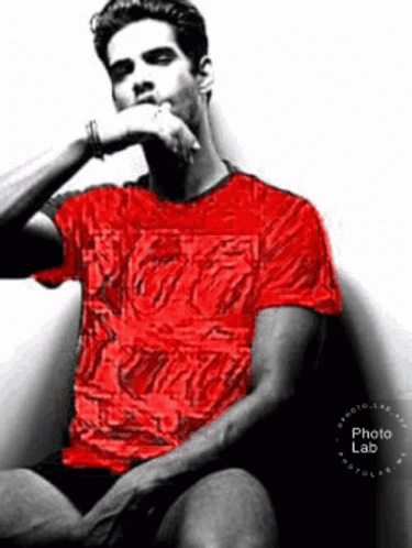Paglalarawan ng Content: a man in a red shirt is sitting in a chair with his hand on his chin .