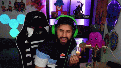 Paglalarawan ng Content: a man with a beard wearing headphones and a hat that says umi on it