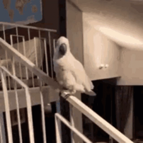 Paglalarawan ng Content: a white parrot is perched on a railing on top of a set of stairs .