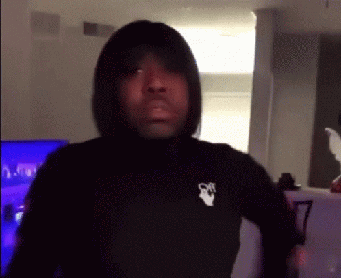 Paglalarawan ng Content: a man with a wig on his head is wearing a black shirt with a white arrow on it .