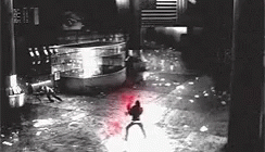 Paglalarawan ng Content: a black and white photo of a man standing in a dark room with a red light coming out of his hand .