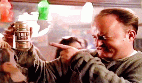 Paglalarawan ng Content: a man holds a can of bitter beer and points at it