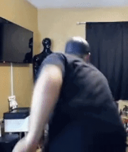 Paglalarawan ng Content: a man in a black shirt is standing in a living room in front of a flat screen tv .