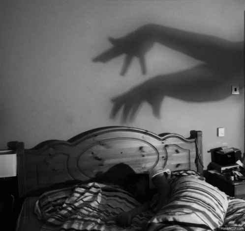 Paglalarawan ng Content: a black and white photo of a person laying on a bed with a shadow of their hands on the wall