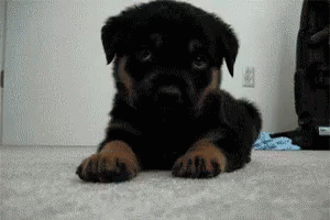 Paglalarawan ng Content: a black and brown puppy is laying down on the floor looking at the camera .