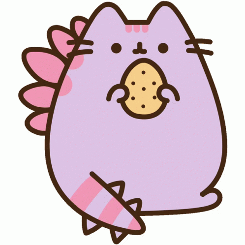 Paglalarawan ng Content: a purple cat with a pink tail is holding a cookie
