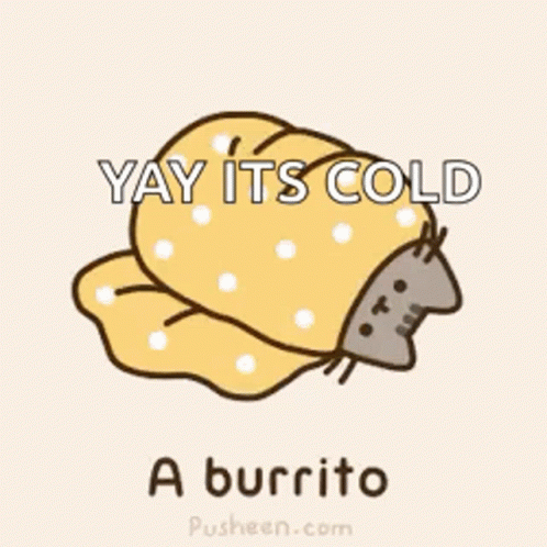 Paglalarawan ng Content: a cartoon of a cat wrapped in a blanket with the words yay its cold a burrito .