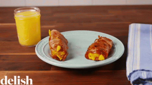 Paglalarawan ng Content: a plate of food next to a glass of orange juice with the word delish on the bottom