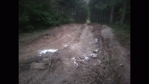 Paglalarawan ng Content: a dirt road in the middle of a forest with trees on both sides