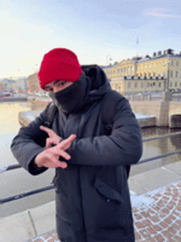 Paglalarawan ng Content: a man wearing a red beanie and a black jacket is standing in front of a body of water ..