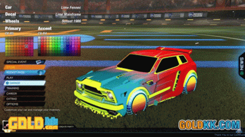 Paglalarawan ng Content: a rocket league game is being played on a screen that says goldkk.com at the bottom