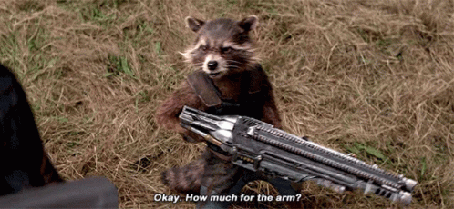 Paglalarawan ng Content: a raccoon holding a gun with the words okay how much for the arm