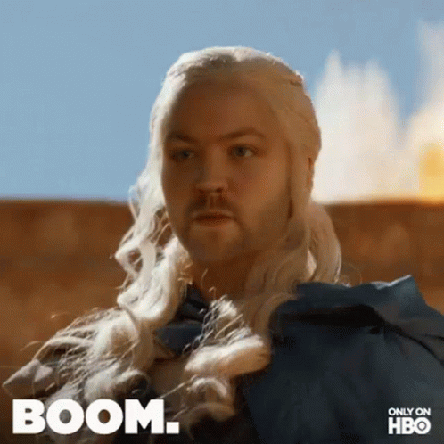 Paglalarawan ng Content: a man with long blonde hair and a beard is standing in front of a fire and the word boom is above him .