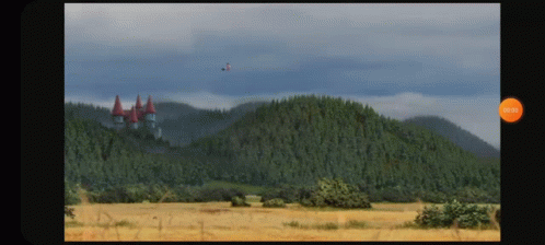 Paglalarawan ng Content: a screen shows a castle on top of a hill in the distance with a pause button in the upper right corner