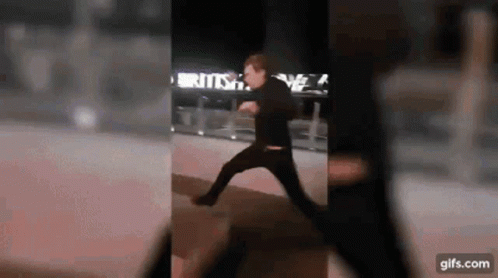 Paglalarawan ng Content: a man is jumping in the air in front of a sign that says ' british ' on it