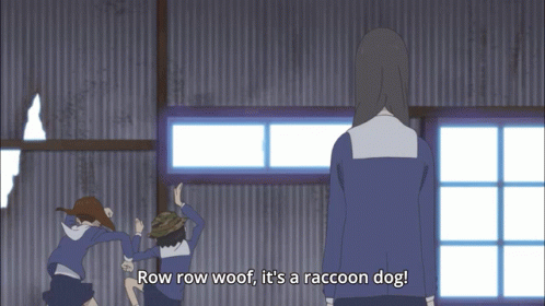 Paglalarawan ng Content: row row woof it 's a raccoon dog says a girl in a school uniform