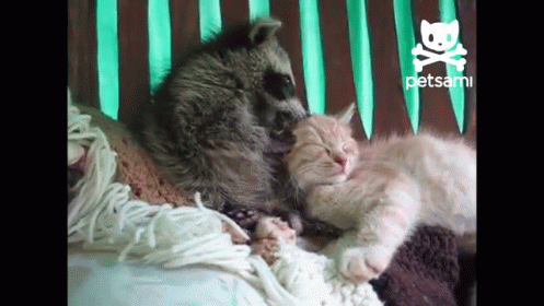 Raccoon Thinks A Kitten Is His Teddy Bear GIF