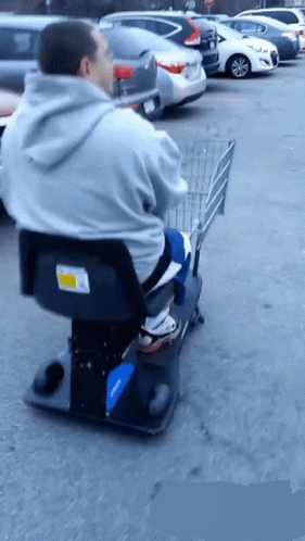 Paglalarawan ng Content: a man in a gray hoodie is sitting in a shopping cart in a parking lot
