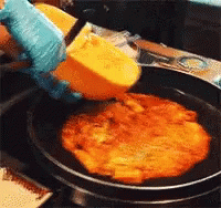 Paglalarawan ng Content: a person in blue gloves is pouring cheese into a pan of food