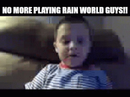 Paglalarawan ng Content: a baby is sitting on a couch with the words no more playing rain world guys