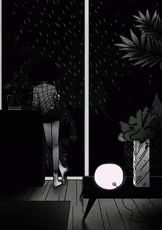 Paglalarawan ng Content: a woman is standing in front of a window looking out at the rain while smoking a cigarette .