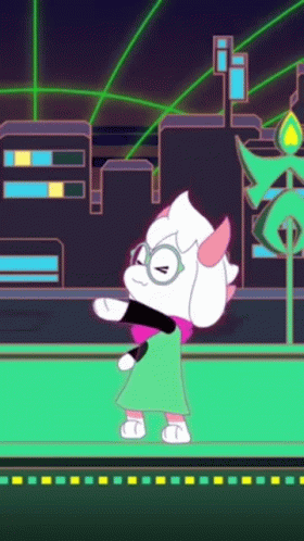 Paglalarawan ng Content: a cartoon of a sheep wearing glasses and a green dress standing on a street .