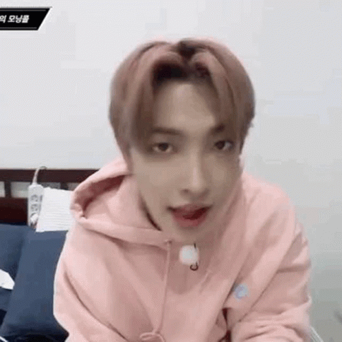 Paglalarawan ng Content: a young man in a pink hoodie is sitting on a bed and making a funny face .