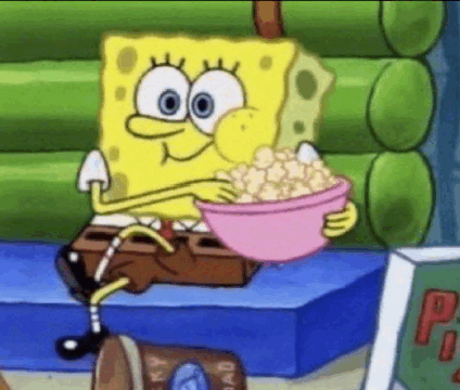 Paglalarawan ng Content: spongebob is sitting on a box eating popcorn from a pink bowl .