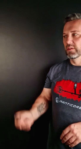 Paglalarawan ng Content: a man wearing a manticore shirt holds his fist in the air