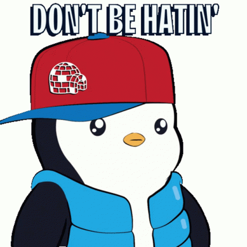 Paglalarawan ng Content: a penguin wearing a red hat and a blue vest says do n't be hatin '