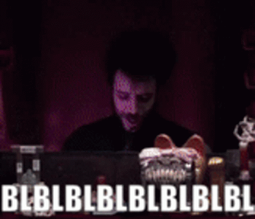 Paglalarawan ng Content: a man sitting at a table with a sign that says ' bbl ' on it