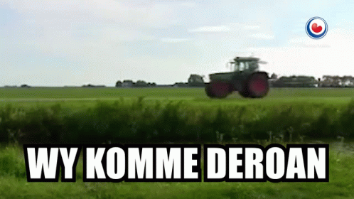 Paglalarawan ng Content: a tractor is driving through a grassy field with the words wy komme deroan written on the bottom .