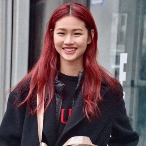 Paglalarawan ng Content: a woman with red hair is wearing a black jacket and a black sweater with the letter u on it