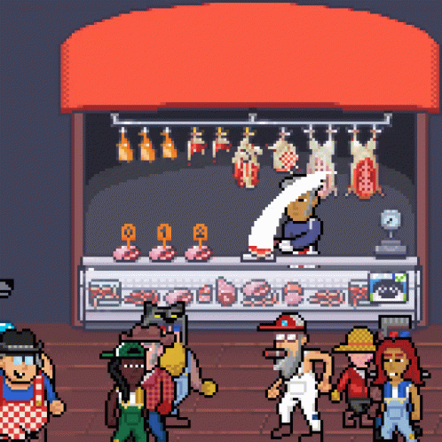 Paglalarawan ng Content: a pixel art drawing of a butcher shop with a red awning