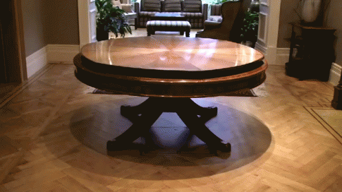Paglalarawan ng Content: a round wooden table in a living room with a couch in the background