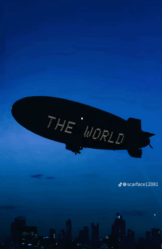 Paglalarawan ng Content: a blimp that says the world is flying in the night sky